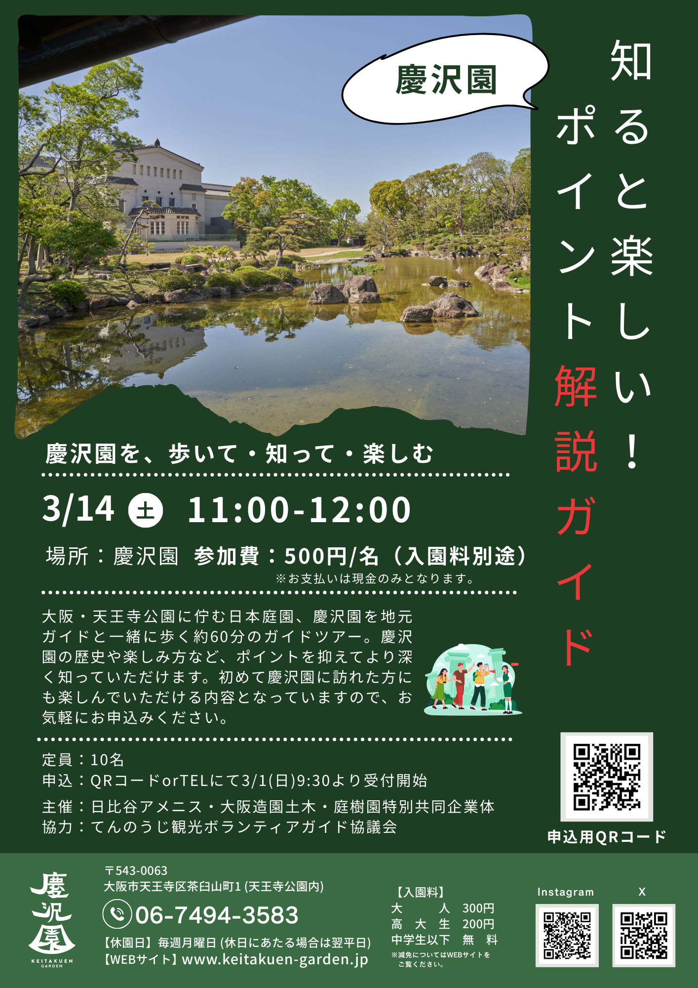 大阪・天王寺公園に佇む日本庭園、慶沢園を地元ガイドと一緒に歩く約60分のガイドツアー。慶沢園の歴史や楽しみ方など、ポイントを抑えてより深く知っていただけます。初めて慶沢園に訪れた方にも楽しんでいただける内容となっていますので、お気軽にお申込みください。